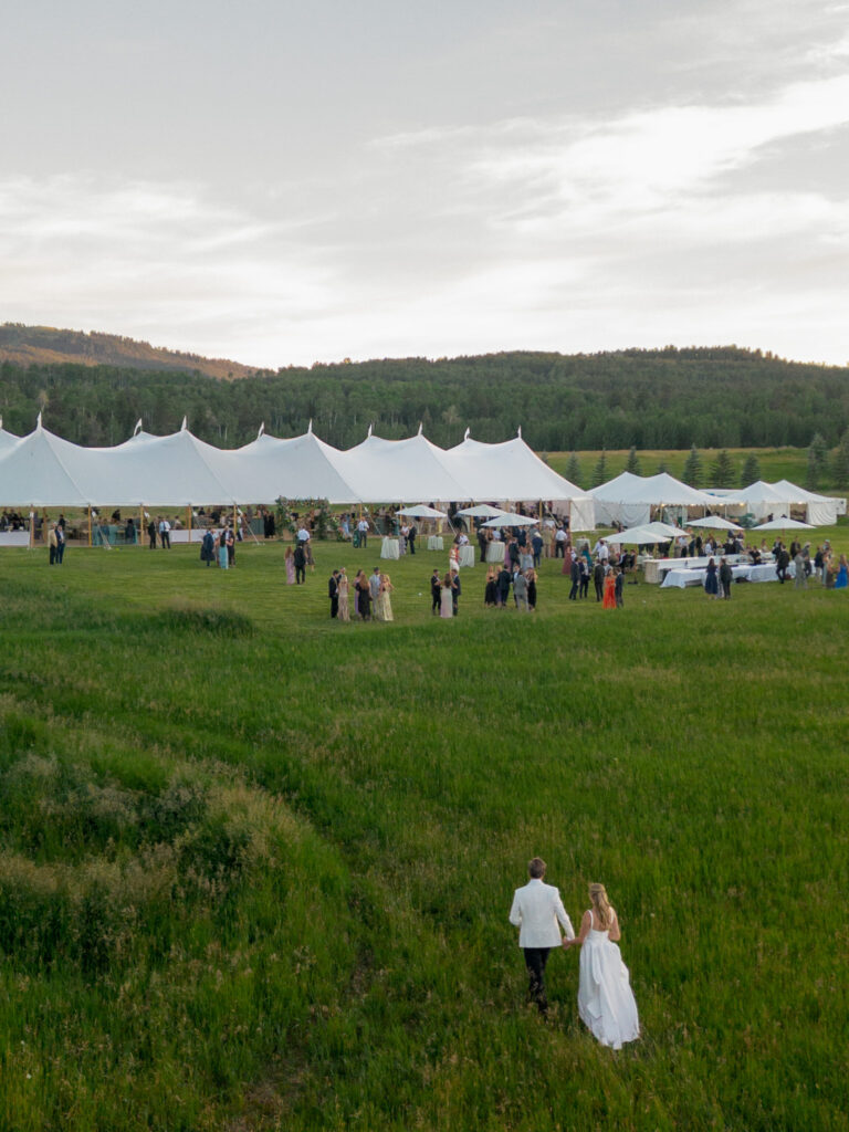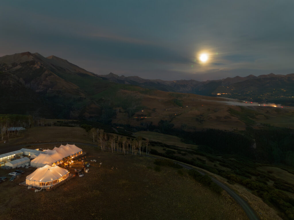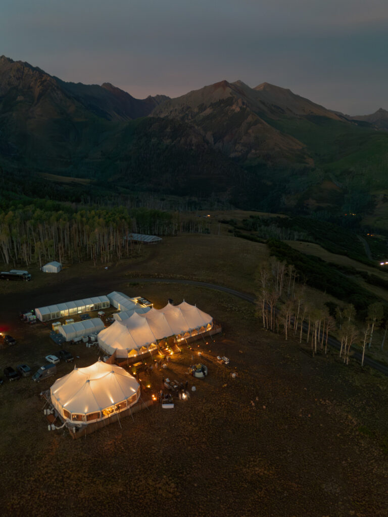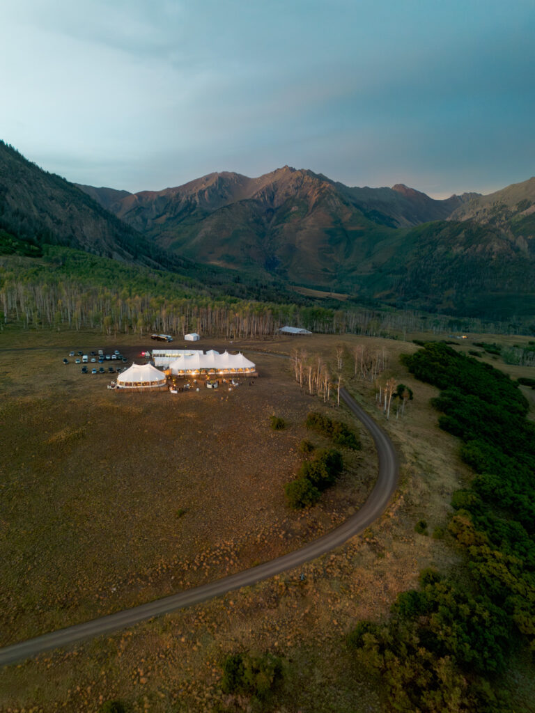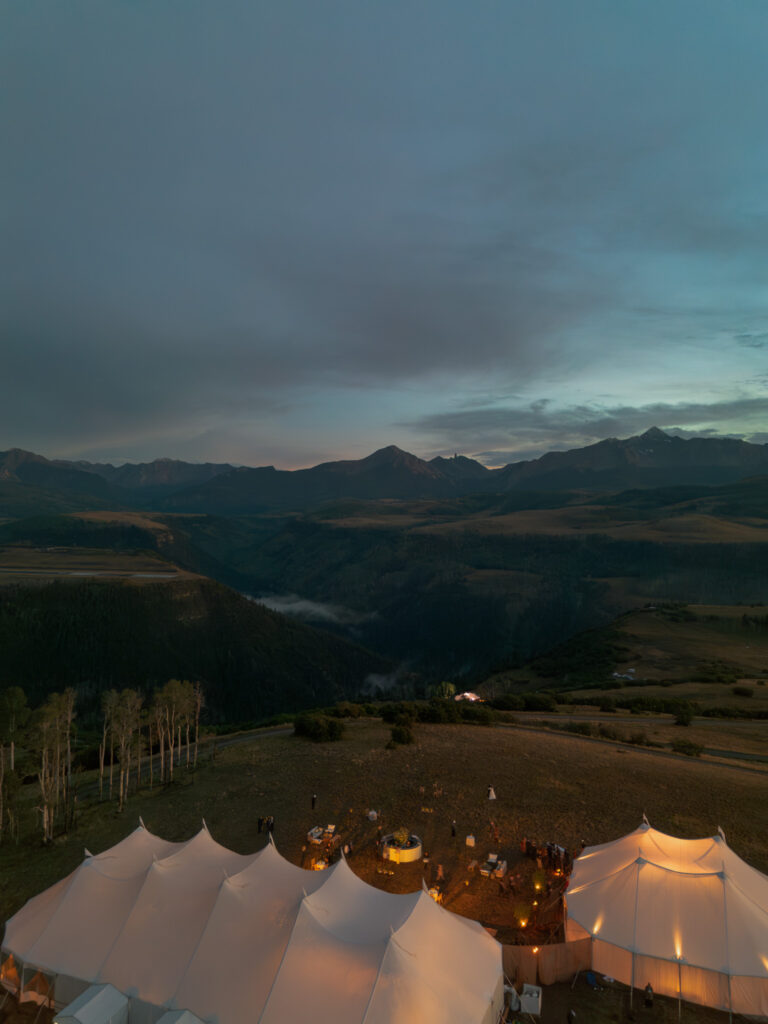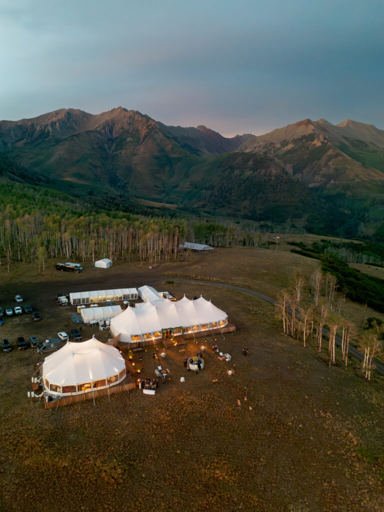 I can confidently say this was the coldest I’ve ever been at a wedding. Early September in a mountain town is always a gamble—push past 11,000 feet into an open field and suddenly snow and lightning enter the chat. I hadn’t grabbed my winter jacket or leggings, and the weather delays pushed the ceremony start well into the evening, leaving almost no window for drone coverage of the tent.